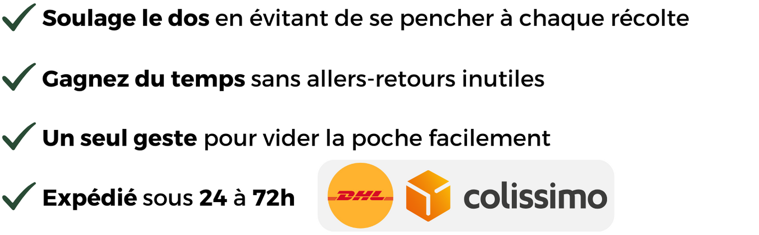 Tout est à portée de main et la grande poche est vraiment utile pour la récolte. Je gagne du temps et je me fatigue beaucoup moins.