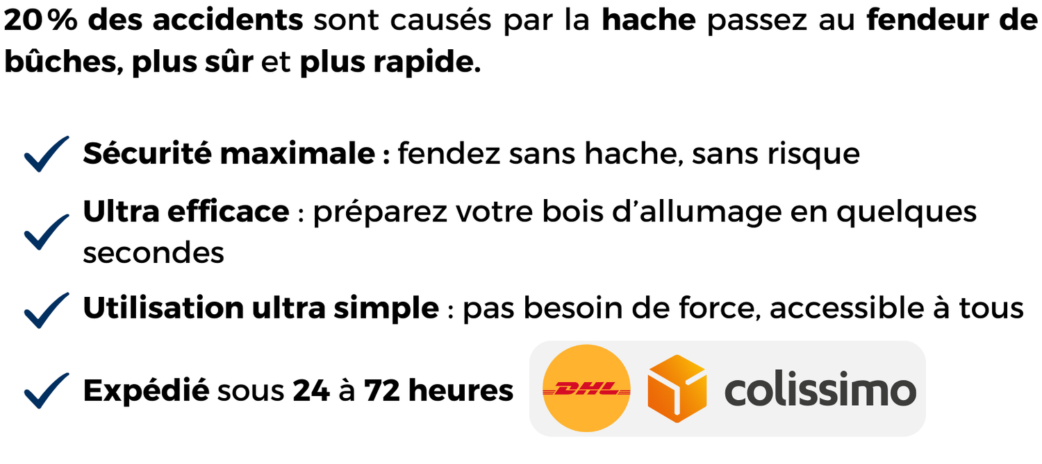 Sécurité renforcée : Plus besoin de manier une hache tranchante — la lame fixe et la frappe contrôlée permettent de fendre du bois en limitant les risques de blessure.