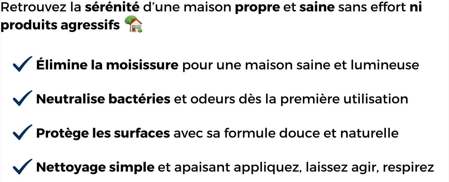 Sa formule douce, sans odeur et non toxique, élimine la moisissure à la source pour un intérieur plus sain, durablement propre et sans effort.