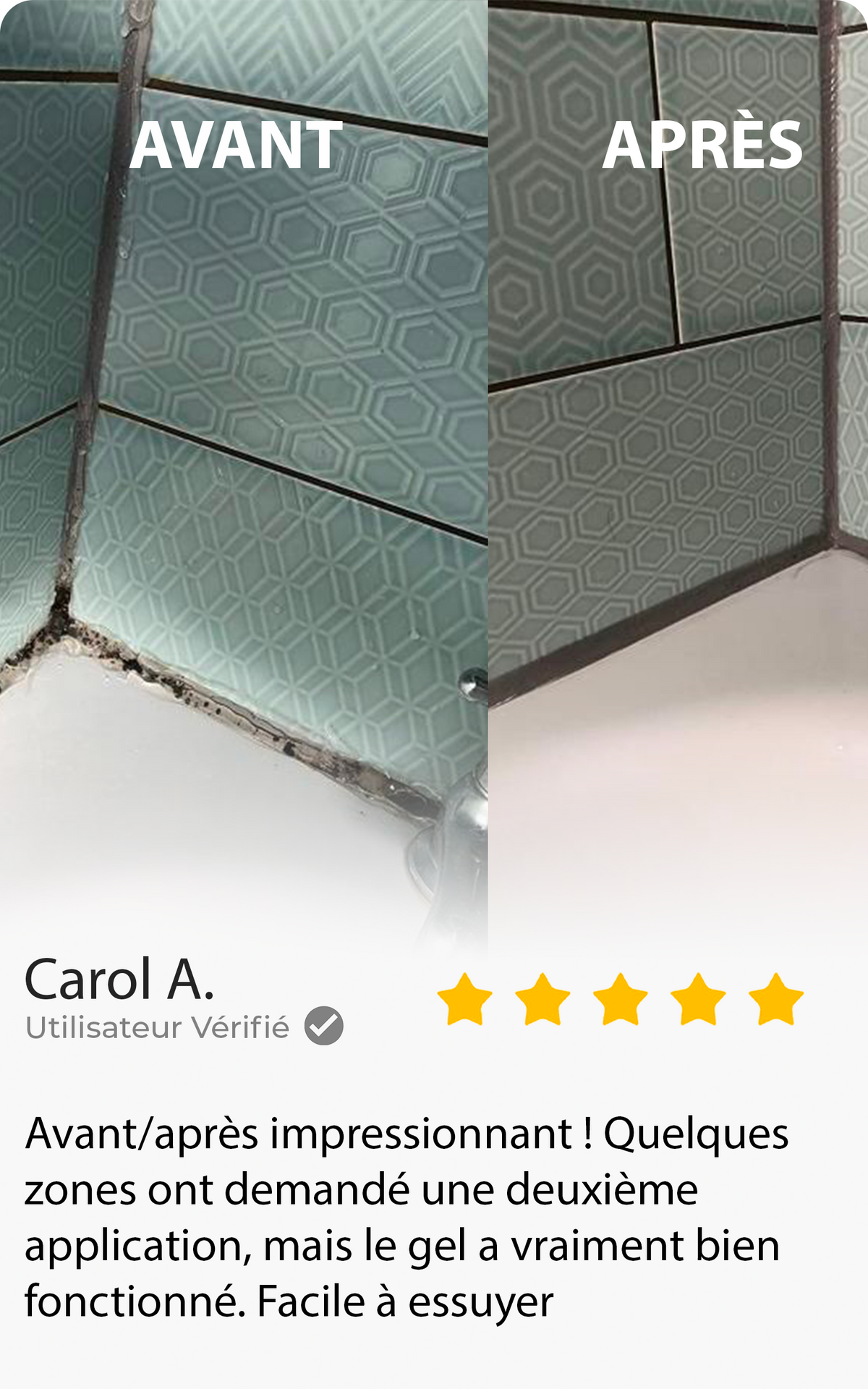 J’ai essayé plein de nettoyants avant, sans résultat. Ce gel a tout enlevé dès la première nuit, sans frotter. Ma salle de bain n’a jamais été aussi propre et ça sent bon le frais !