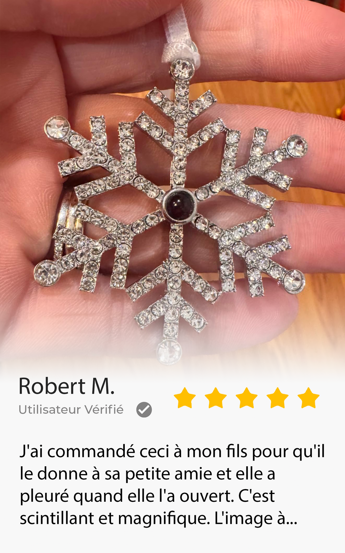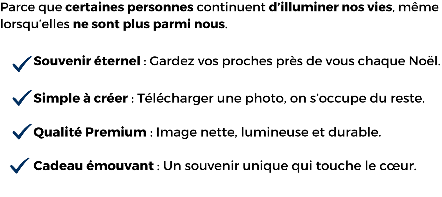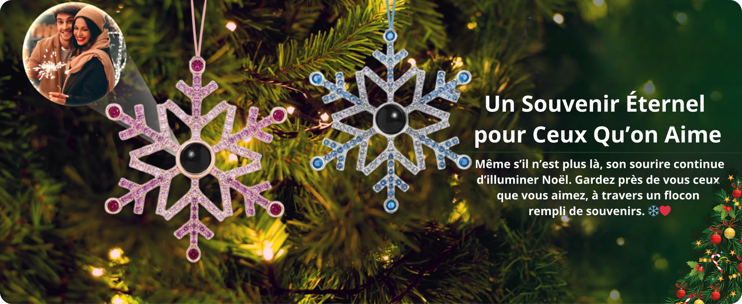 Ce flocon personnalisé est conçu avec des matériaux de qualité, et votre photo y est imprimée avec une clarté exceptionnelle pour que chaque détail, chaque sourire, reste intact. Un souvenir unique, lumineux, qui veille sur votre famille au cœur du sapin.