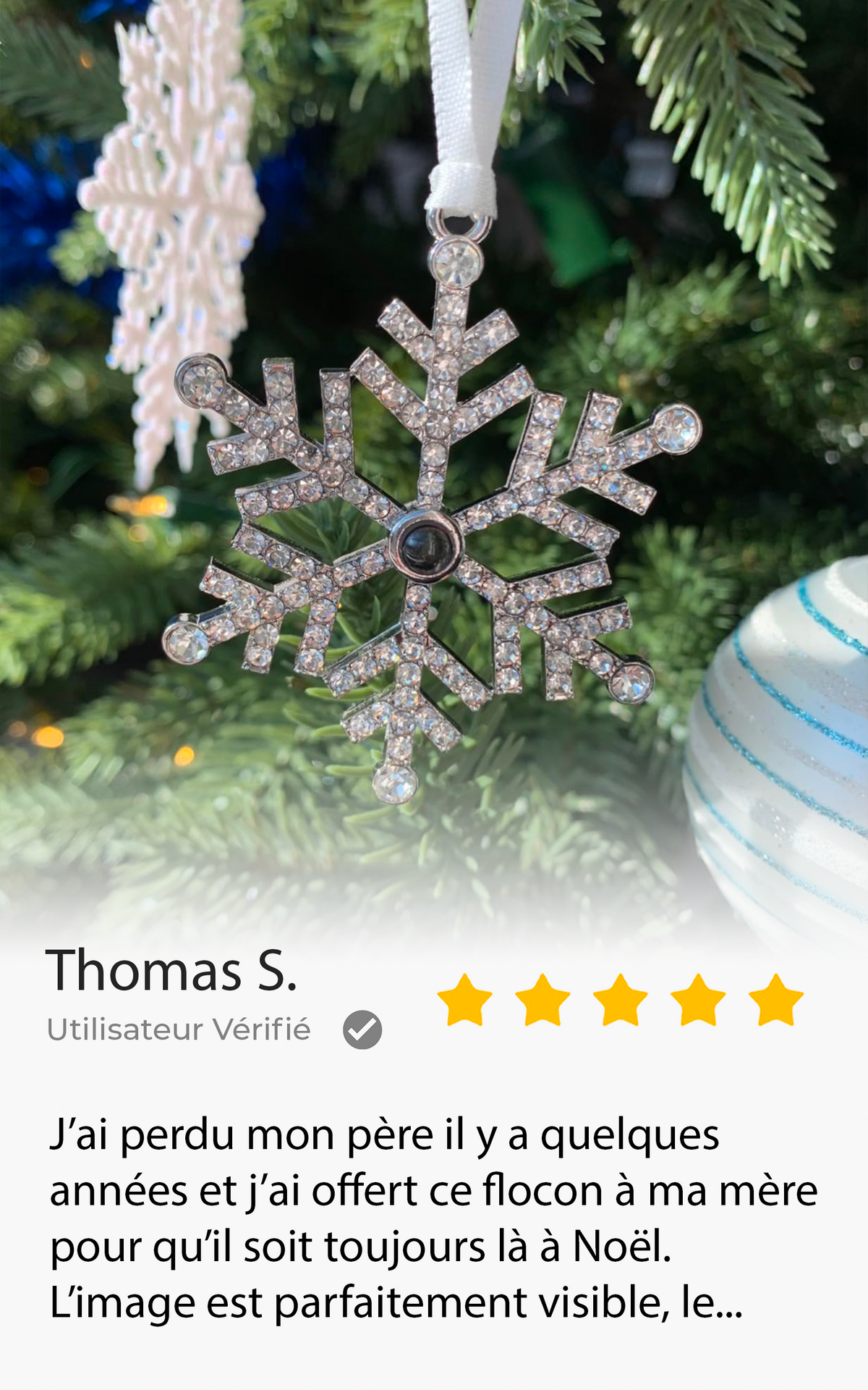 Ce flocon personnalisé vous permet d’y placer sa photo, pour qu’il continue de veiller sur votre famille, au cœur du sapin.