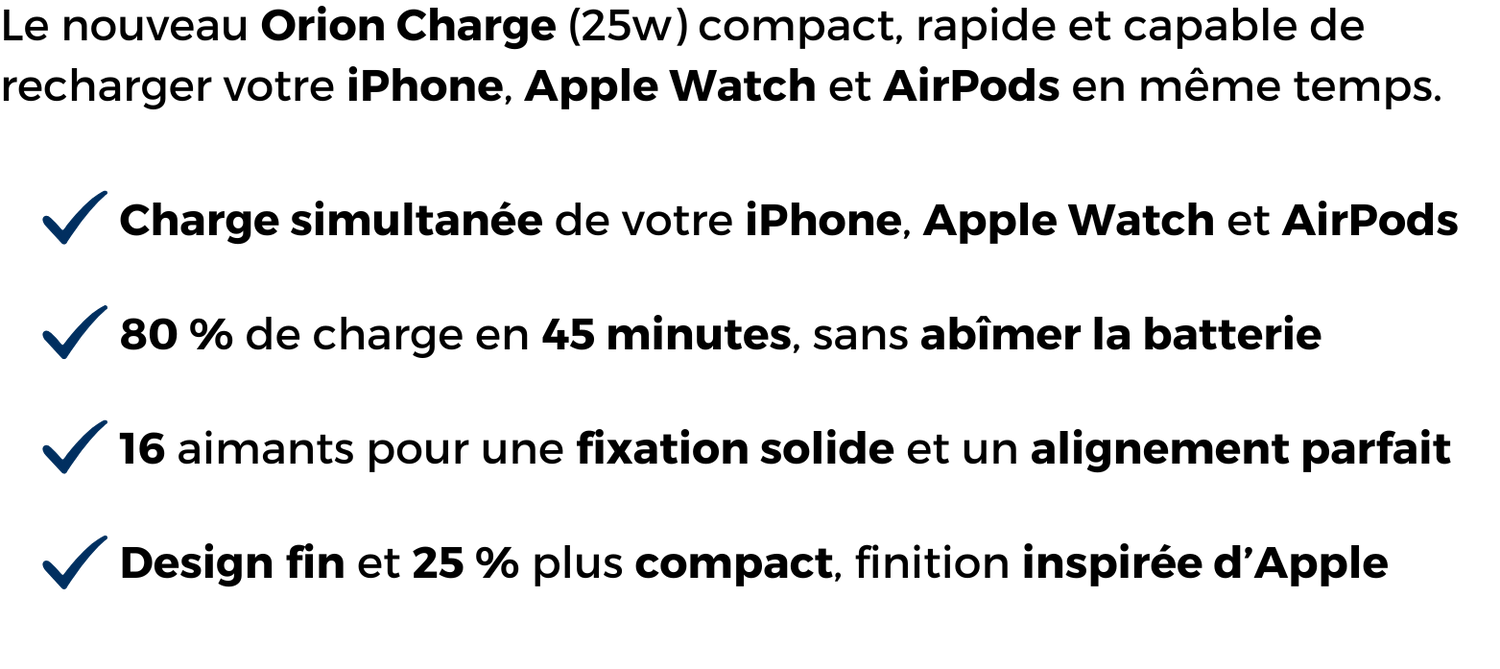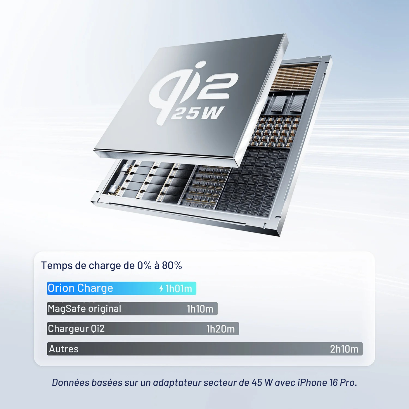 La nouvelle génération de charge rapide certifiée Qi2.2 signée Orion, capable de recharger votre iPhone à 50 % en seulement 37 minutes, sans surchauffe ni usure de la batterie, dans un design premium et magnétique pensé pour tous vos appareils Apple.