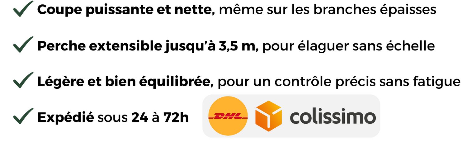 Conception Ergonomique : Équipée d'une perche télescopique, elle permet d'atteindre facilement les branches les plus hautes sans échelle, tout en offrant confort et réduction de la fatigue grâce à sa légèreté.